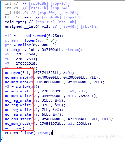 看到这几个uc_开头的函数,让我想到了unicorn-engine,Unicorn是一个轻量级, 多平台, 多架构的CPU模拟器框架。分析这个函数得知这个函数的大概逻辑就是读取func文件然后使用unicorn-engine模拟执行,可以通过uc_open这个函数的参数得到字节码文件func的系统架构,参数的具体意思需要去github上看unicorn-engine源代码的注释。