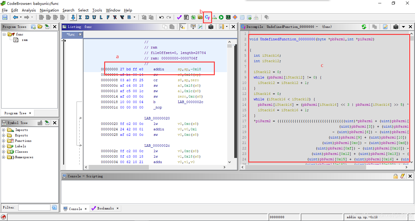 由于IDA正常不转插件的情况下MIPS没办法看伪代码,所以我们上另一个神器Ghidra,这个程序可以分析MIPS架构的伪代码。