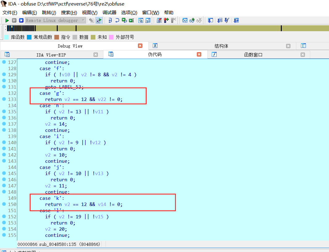 然后动态调试,发现到index==12的时候,出现了很多分支可以直接返回1,有三种选择 6 ,g ,k